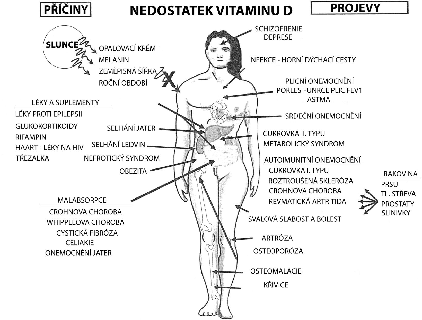 Na obrázku můžeme vidět model znázorňující příčiny a důsledky nedostatku vitaminu D. Značný vliv na úroveň vitaminu D má také stav našeho trávicího systému a pochopitelně také zdraví jater a ledvin, kde probíhá metabolismus vitaminu D.